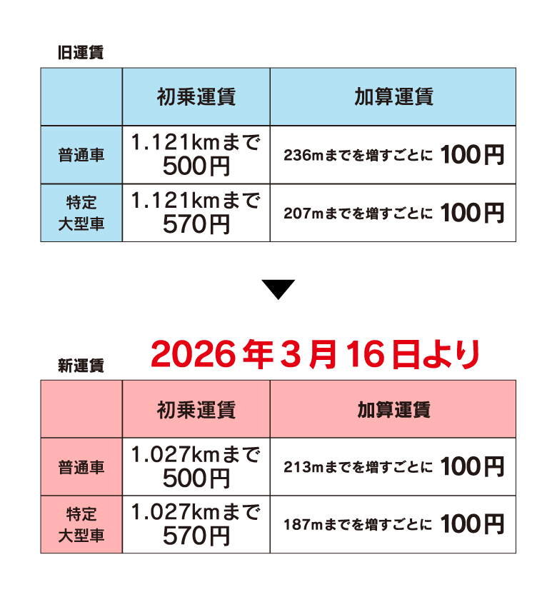 【2026年3月16日~】運賃改定いたします 平素は格別のご愛顧を賜り、厚く御礼申し上げます。このたび一般乗用旅客自動車運送事業(タクシー)の新たな公定幅運賃が公示されました。これに伴い、弊社におきましても2026年3月16日(認可施行予定)の運行車両より、新たなタクシー運賃・料金にて営業を行ってまいります。ホームページ上に記載の料金表につきましては3月16日より正式に変更をいたします。なお、「迎車料金」ならびに「予約料金」につきましては変更ございません。昨今の物価高やドライバーの労働環境の改善・サービス利便性の向上などの観点から皆様にはご迷惑をおかけいたしますが、引き続き変わらぬご愛顧を賜りますようよろしくお願い申し上げます。 料金表は下記ページをご確認ください タクシー料金表はこちら タクシー料金表はこちら 定額運賃はこちら 【2026年3月16日~】運賃改定いたします 続きを読む »